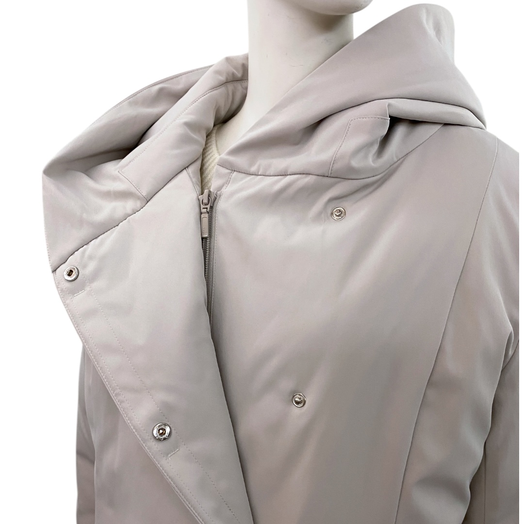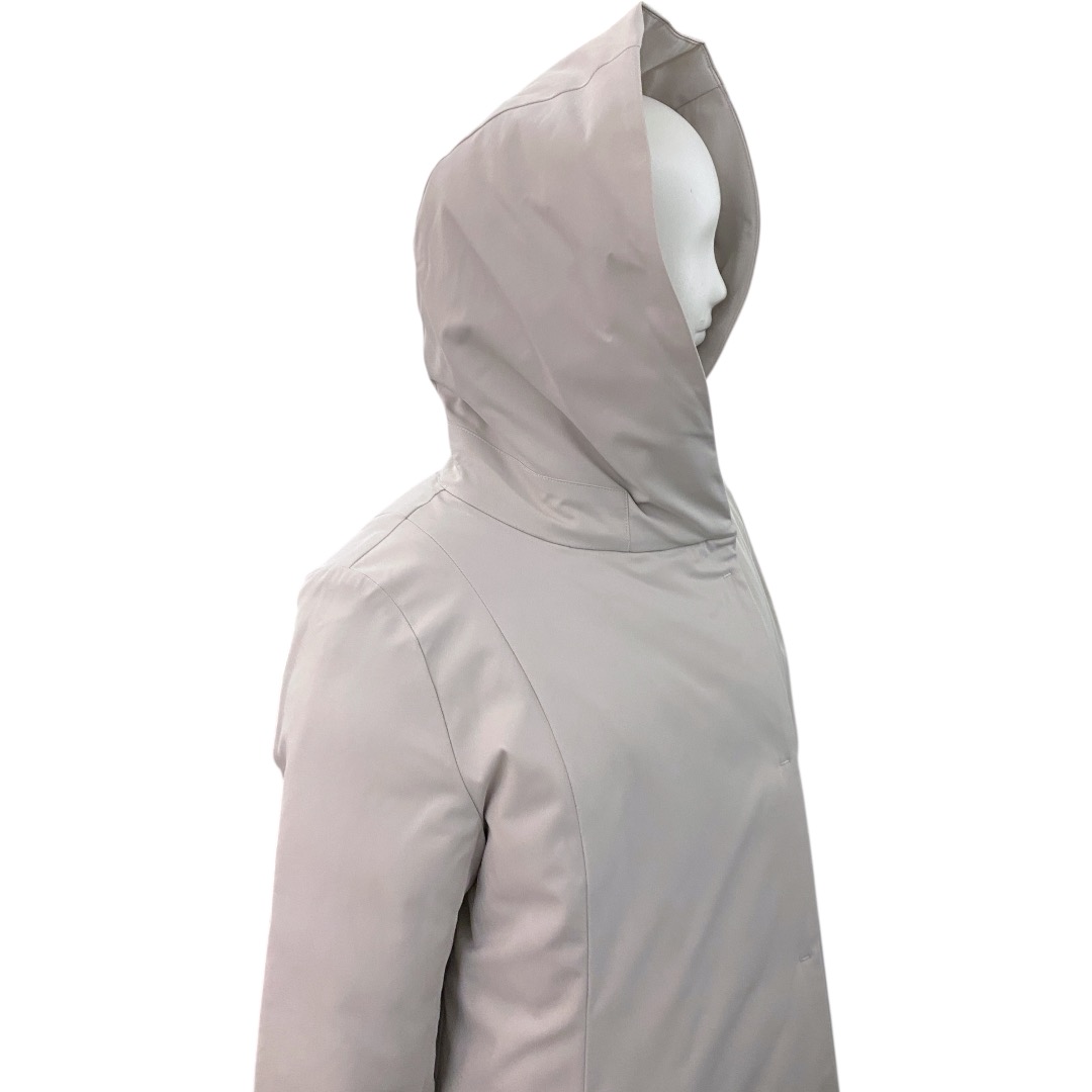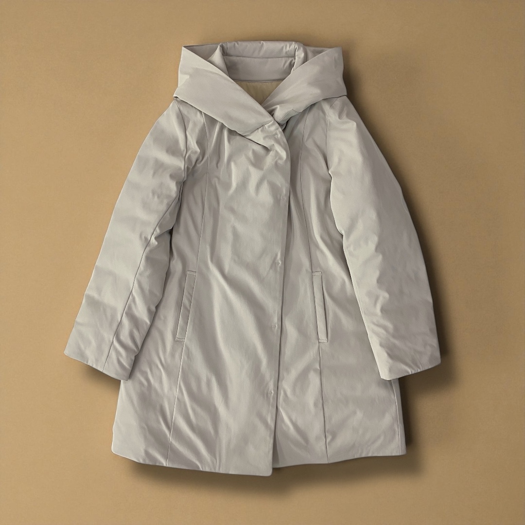 上品な素材感と機能性を兼ね備えた、大人の女性に最適なフード付きコートです。すっきりとしたAラインシルエットは、着る人に洗練された印象を与えます。光沢を抑えたマットな質感の生地が、エレガントなムードを演出します。