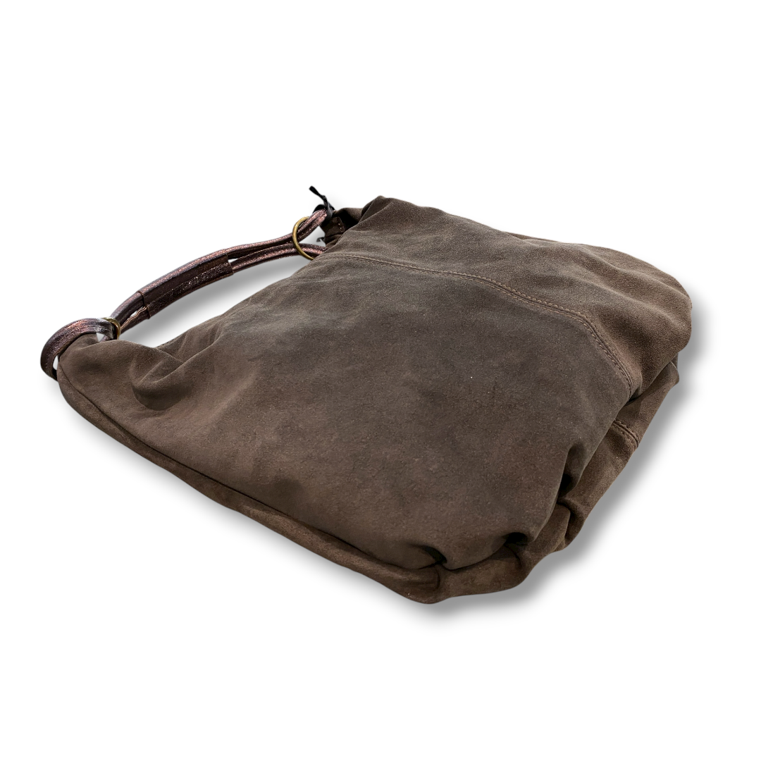 ワンショルダーのスウェードバッグです。 ハンドルはラミネートレザーになっています。