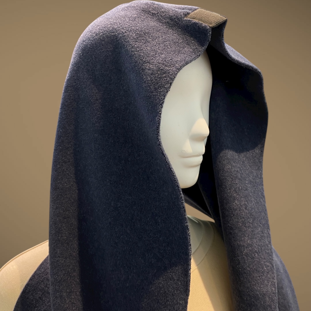 頭からすっぽり被り、そのまま首元にドレープを作ることで、冬の冷たい風から顔周りと首元をしっかりと守ります。頭部から肩にかけて流れるような美しいシルエットは、シンプルで存在感があり、いつものアウターにプラスするだけで、スタイリング全体をアーティスティックな雰囲気に高めてくれます。