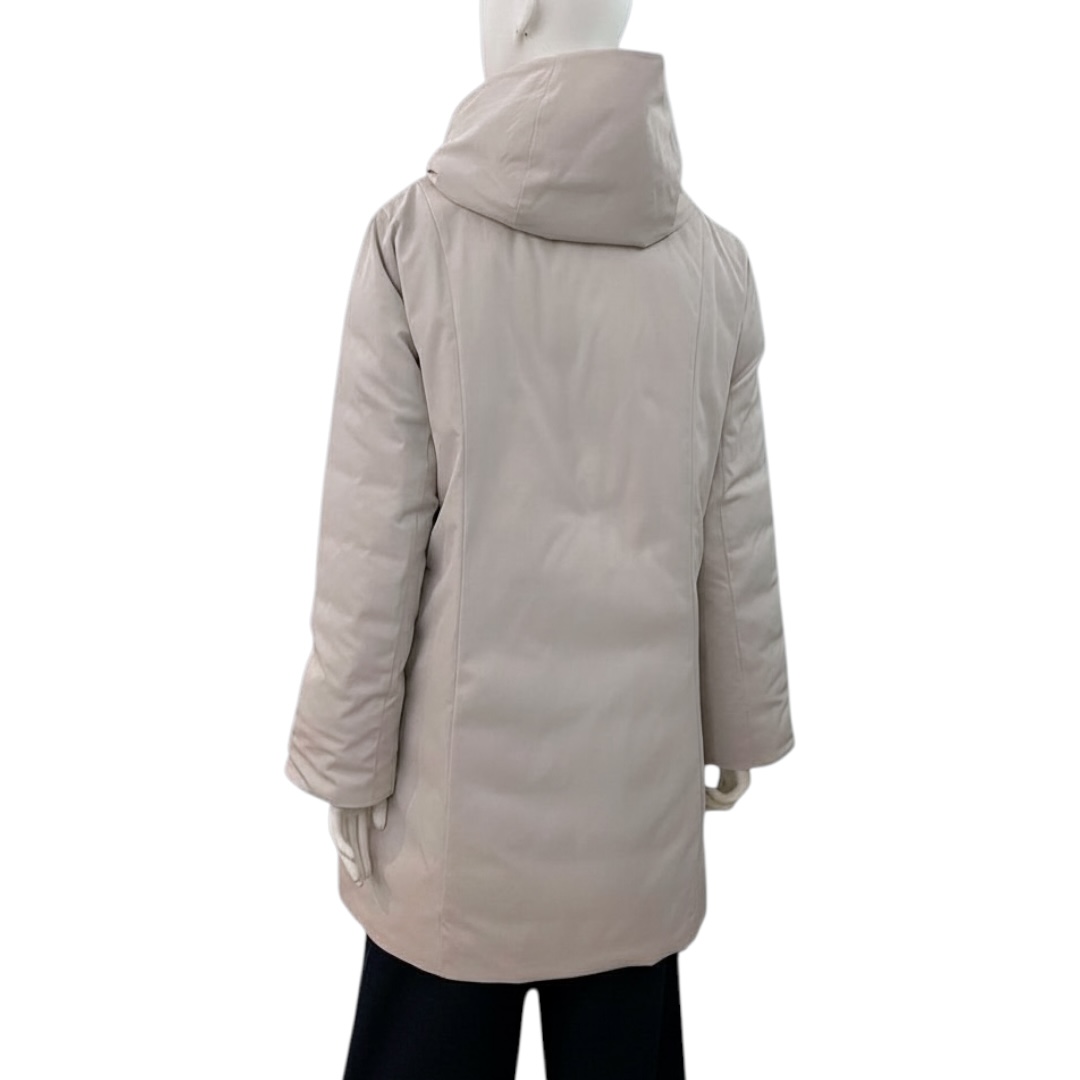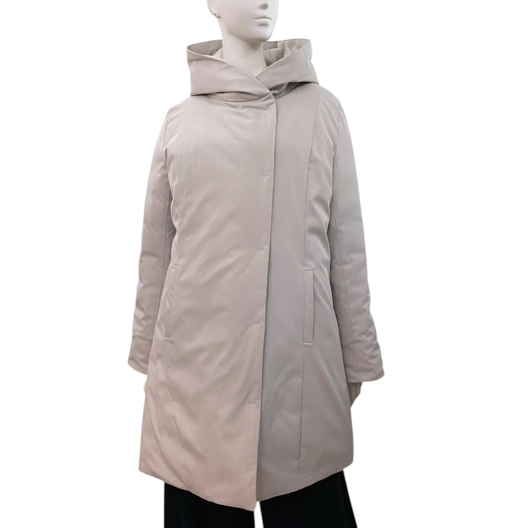 上品な素材感と機能性を兼ね備えた、大人の女性に最適なフード付きコートです。すっきりとしたAラインシルエットは、着る人に洗練された印象を与えます。光沢を抑えたマットな質感の生地が、エレガントなムードを演出します。